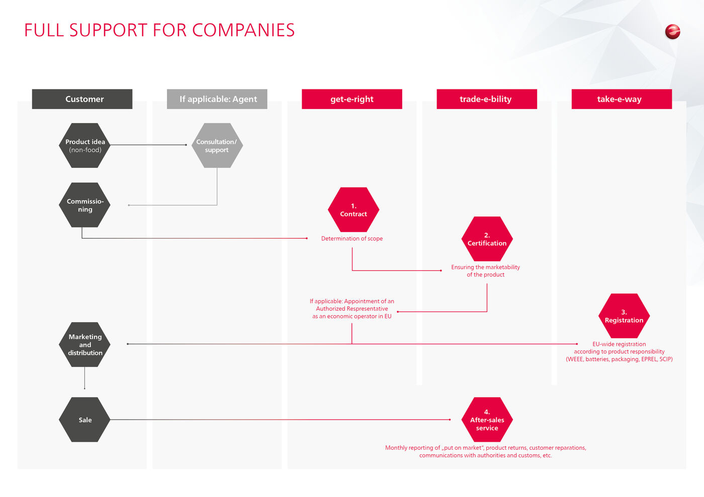 The company e-systems Holding GmbH & Co. KG (e-systems) is the parent company of the companies take-e-way GmbH, get-e-right GmbH and trade-e-bility GmbH. Under its umbrella, e-systems pools the expertise of the three specialized companies surrounding the subjects of extended producer responsibility and product compliance.